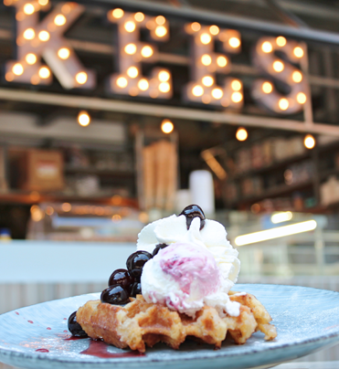 One of the best ice cream makers in the country can be found in a corner of the gourmet market. A wide selection of tasty flavours awaits you and if that’s not what you’re in the mood for, they serve warm waffles too. Both topped with fresh, seasonal products.